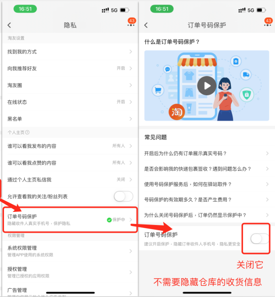 关闭流程:【淘宝——我的淘宝——设置——隐私——订单号码保护——关闭它】