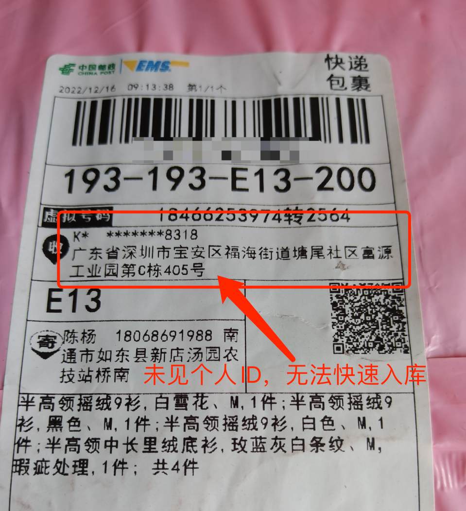 无ID包裹需要等待用户联系小客服查询,或者进入knock【首页】-【我要集运】-【添加国内快递单号】自行查询是否入库。但极大耽搁了您的包裹入库时间,影响了您的转运效率。