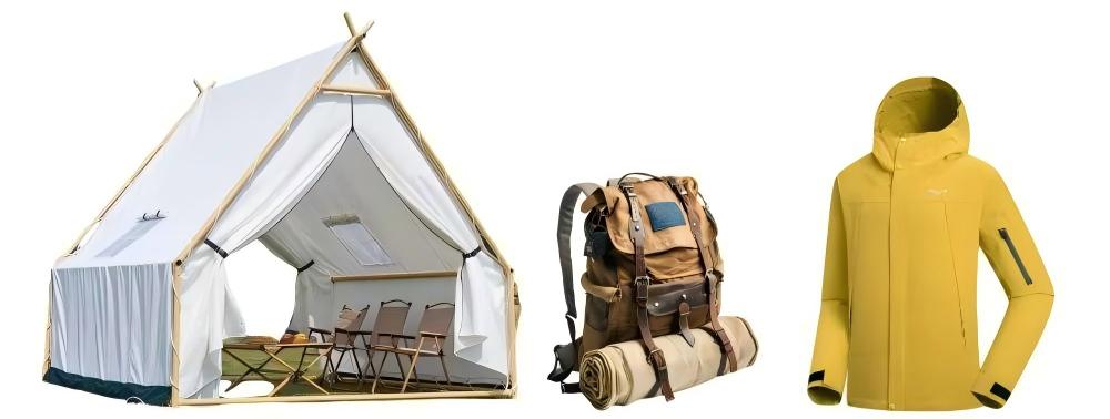 户外装备:帐篷、睡袋、防潮垫、折叠桌椅、野餐垫、登山杖、背包、户外餐具(非金属刀具)等;