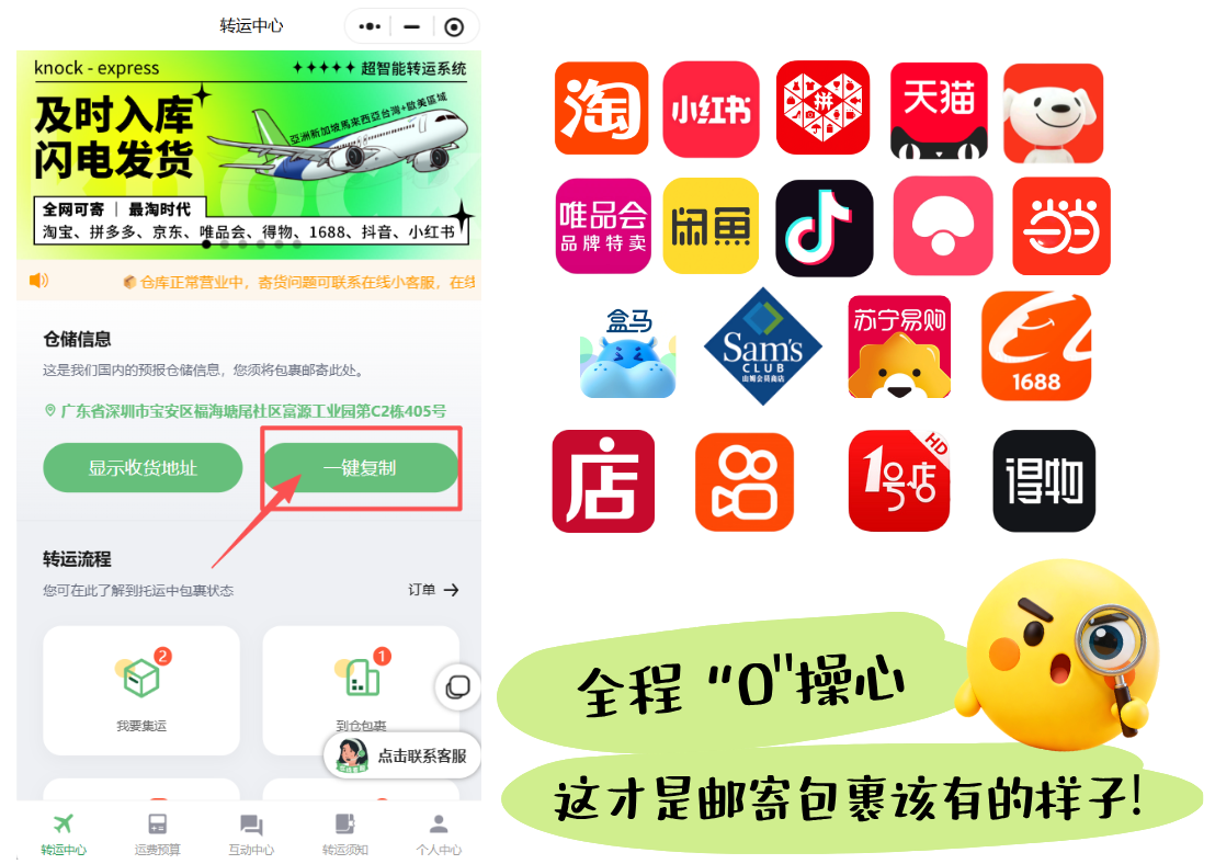 在knock集运小程序内获取仓库地址,设置为任意平台网购的收货地址。