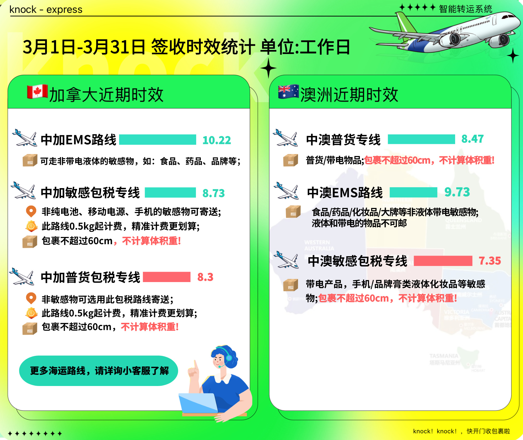 加拿大、澳洲地区整体运速稳定,通关快速,所有路线均能在参考时效内签收。