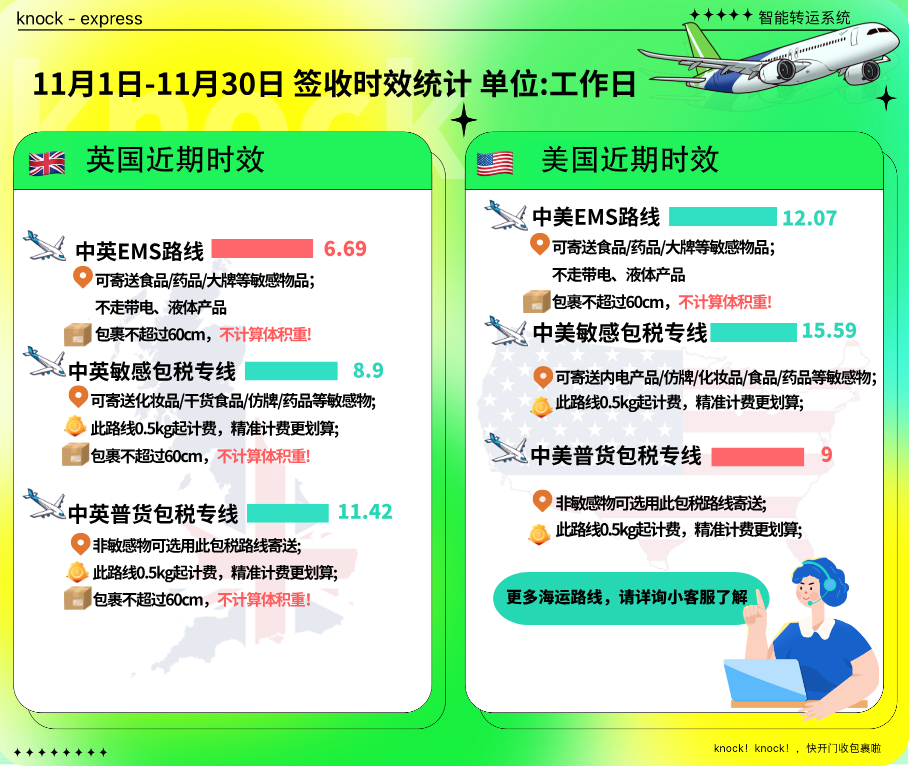 英国地区持续好运!空运专线可不计体积重,运费较往年更优惠,运输时效稳定快速。12月预计运速保持平稳,具体报价欢迎咨询客服小knock。