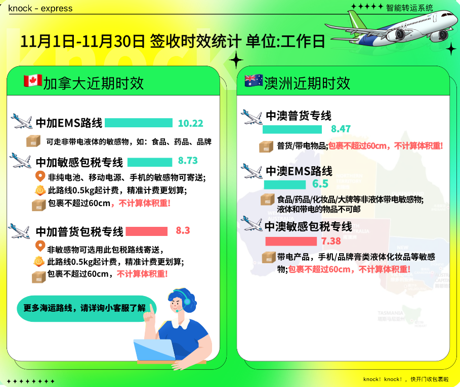 加拿大、澳洲地区整体运速稳定,通关快速,所有路线均能在参考时效内签收。