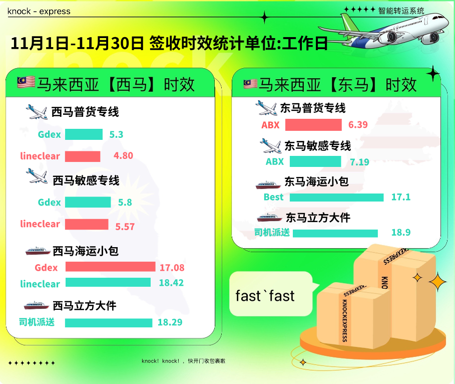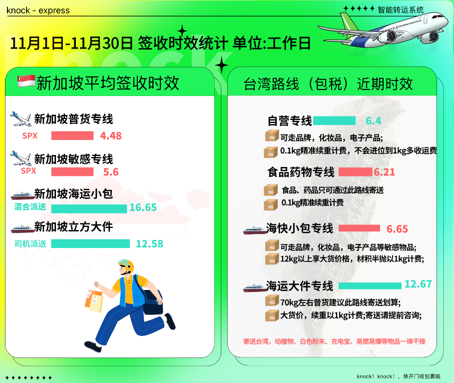 台湾地区11月部分批次包裹受到月初季风和非洲猪瘟防疫管控影响,清关及末端派送时效欠佳。但92%以上包裹均在参考时效内签收。新加坡末端派送优化后运势稳定,海运、空运效率都有不错的表现,12月都将持续好的态势,运输时效预估稳定。感谢宝子们对knock的信任与支持。月都将持续好的态势,运输时效预估稳定。