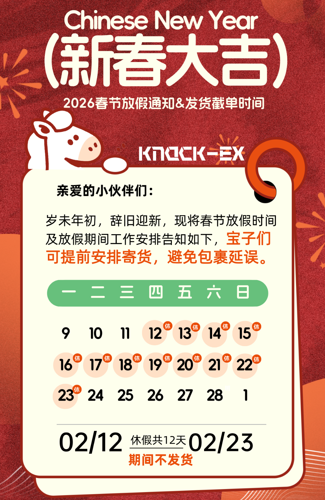 春节将近,建议您尽快完成寄送计划,预留足够的仓库操作时间,避免无法节前发货。若节前未发出,我们将在节后统一安排,希望您理解。knock预祝您能顺利签收年货包裹,过个幸福年。